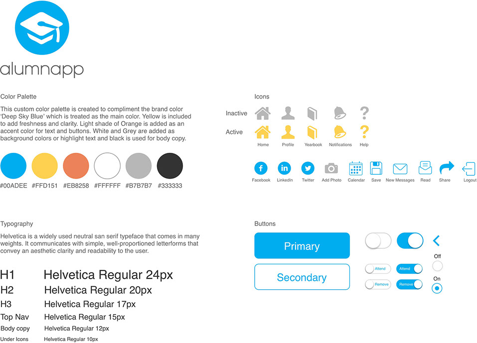 The next task was to create a style guide which defines the elements that will be used in the design. The guide included the logo, colors, fonts, and icons. This helped speed up the next step of designing the final screens, as all the design elements were in place.